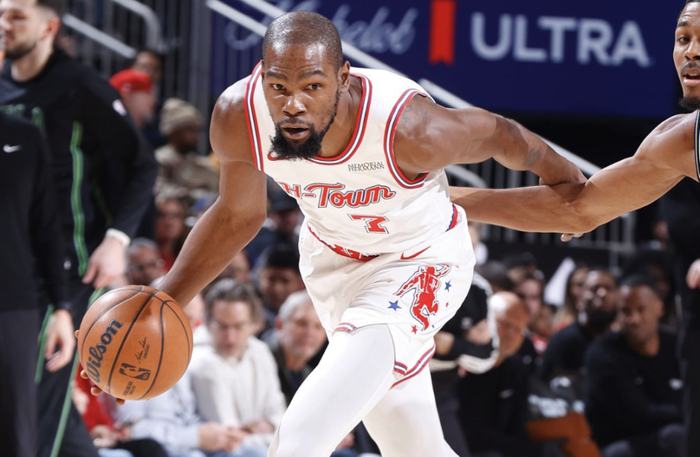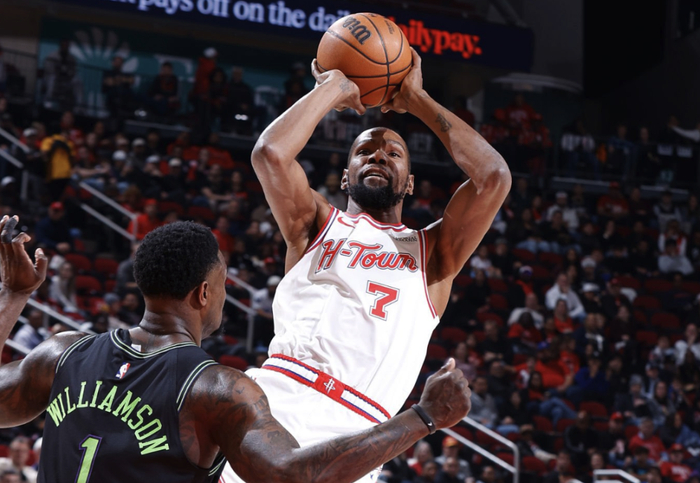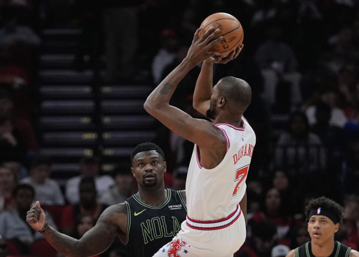 首节比赛,火箭开局实现多点开花,前5次得分分别来自场上5名不同球员,杜兰特造成锡安犯规2罚1中,取得个人全场首次得分。杜兰特展示中远距离投射威胁,个人连得5分,率领火箭打出17-6的进攻压制,成功拉开分差到双位数。